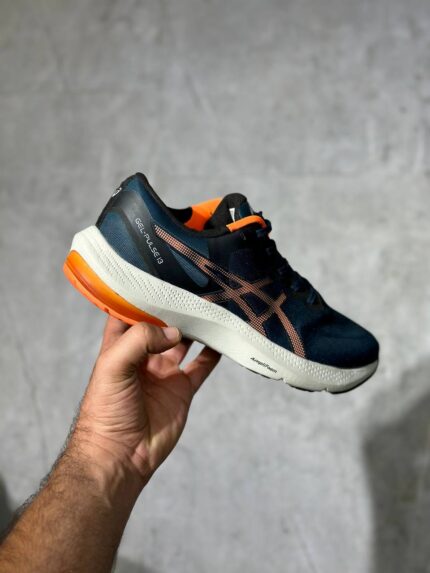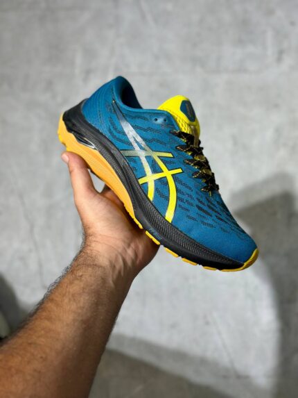کتونی اسیکس رنگ آبی با جزییات زرد نارنجی مشکی مردانه
